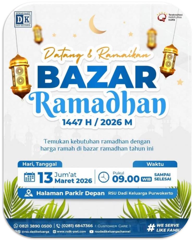 Dalam suasana penuh berkah di bulan suci, RSU Dadi Keluarga Purwokerto mengundang Anda untuk meramaikan Bazar Ramadhan 1447 H / 2026 M. Sebuah kesempatan untuk memenuhi berbagai kebutuhan Ramadhan dengan harga yang ramah serta suasana yang hangat dan penuh kebersamaan.