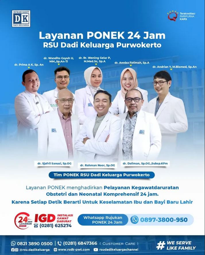 Hubungi Customer Care RSU Dadi Keluarga di nomor 0821 3890 0500 atau nomor Telfon Informasi di nomor 0281 6847366 untuk informasi lebih lanjut mengenai pelayanan RSU Dadi Keluarga Purwokerto.